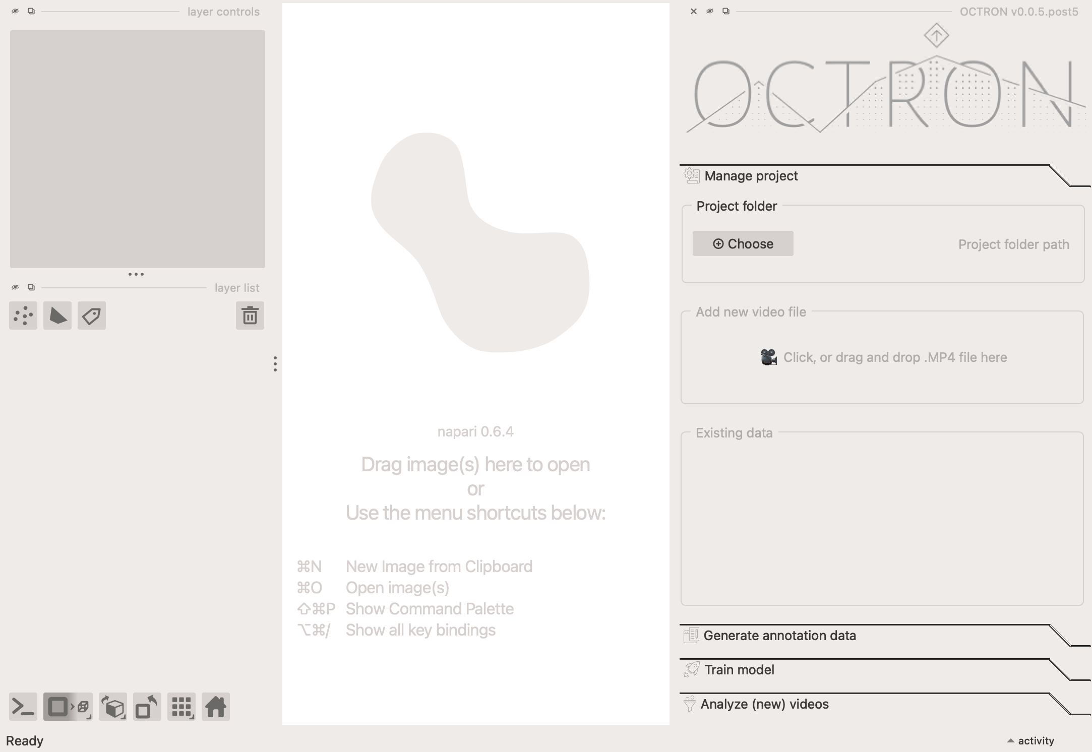 - Main OCTRON GUI (right): this is where you navigate through the different steps of the process, from opening your project (Manage project tab), annotate videos (Generate annotation data tab), train a model on your annotated videos (Train model tab), and use your trained model to analyze new videos (Analyze (new) videos tab).
